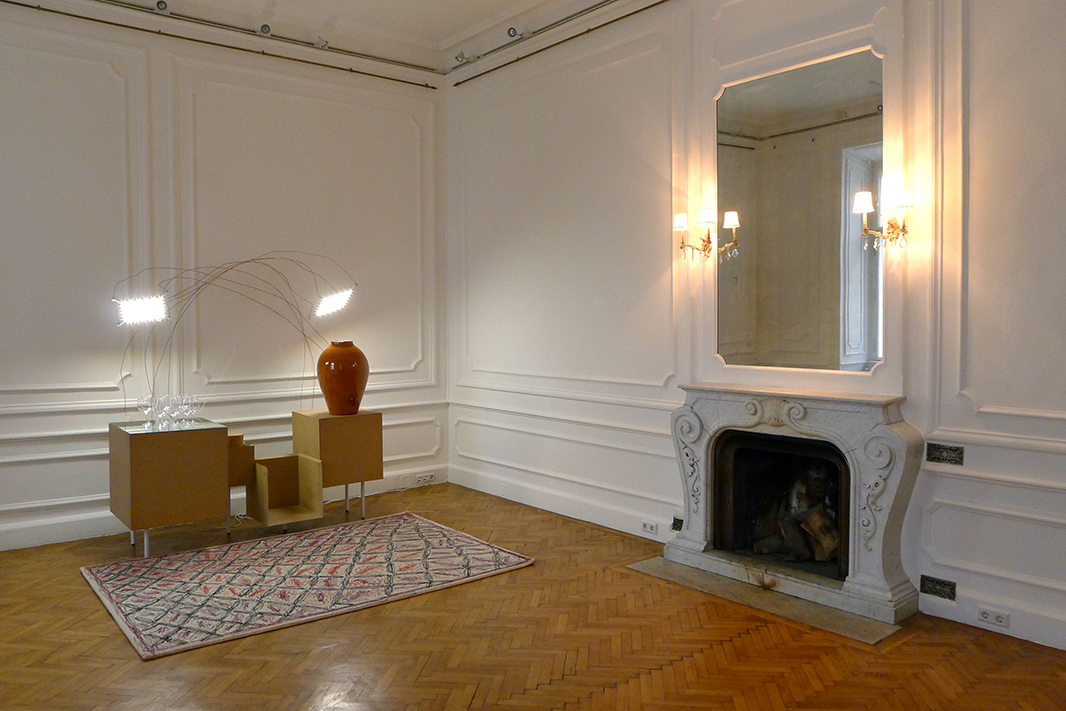 Still Life with Light is made by the “Free Port” prototype, 10 wine glasses, 2 Cyclops lamps, a piece of cork, fliers, a carpet and a handmade vase full with a “bag in the box” of red wine.