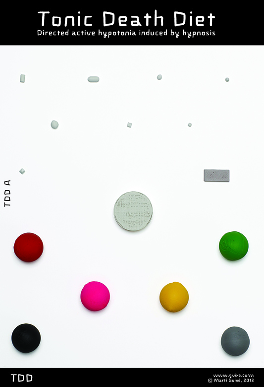 The Tonic Death Diet combines 3 areas of knowledge: medicine, animal biology and hypnosis. The Diet is designed to subvert the concept of the virtual world as a substitute of the real world, creating the opposite perception. The 2 main components of the TDD are the autohypnosis app and the nutrition pills. The diet helps you reach a temporary transordinary lifestyle status. This status promotes virtual activities that can be performed through any conventional computer interface. This temporary situation rejects real world, as conventionally understood. The Tonic Death Diet can be followed through ritual, spiritual, functional, emergency or fun purposes. It can also be followed simply to avoid gastronomy. A temporary active hypotonia is caused as directed by the autohypnosis app, and the body reaches a coma-like status. Body temperature descends to a hypothermia off 35,9 degrees. The mind feels active and concentrated; basic body functions are minimized but active. The trance state can last for a long period of time and the nutrition pills help you stay in it. The pills provide clean and healthy nutrition.