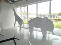 My Zoo is a collection of animals made of white cardboard, sold disassembled to be folded and constructed at home. Afterwards, they can be coloured in or painted. They are quite large: the elephant, the giraffe, the lion, the camel… so large that you can walk through the whale’s mouth and into its belly, travelling through the confines of reality. All the animals are harmless, do not bite, are lightweight, and can be easily recycled as they are made of cardboard.